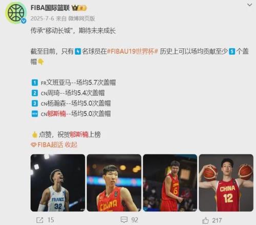 迄今為止,只有四名球員能在U19世界杯場(chǎng)均5帽,另外三位是文班亞馬(法國(guó))、楊瀚森和周琦,他們均通過(guò)選秀進(jìn)入了NBA。