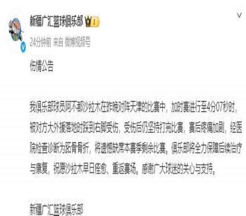 新疆男籃上場比賽106-101加時險勝天津男籃,換帥之后首次獲得勝利,原本以為新疆男籃能夠借助這場勝利再次向季后賽發(fā)起沖擊,但是新疆男籃依舊沒有逃脫傷病的厄運。新疆男籃官方宣布,阿不都沙拉木在昨晚對陣天津的比賽中,加時賽進行至4分07秒時,被對方大外援落地時踩到右腳受傷,賽后經(jīng)醫(yī)院檢查診斷為跖骨骨折,將遺憾缺席本賽季剩余比賽。在阿不都沙拉木賽季報銷之前,新疆男籃已經(jīng)連續(xù)傷了朱旭航、吳冠希、西爾扎提三名大將,此番阿不都沙拉木再次受傷之后,新疆男籃已經(jīng)徹底失去了季后賽的希望,很難與北控、廣州等隊競爭季后賽席位。