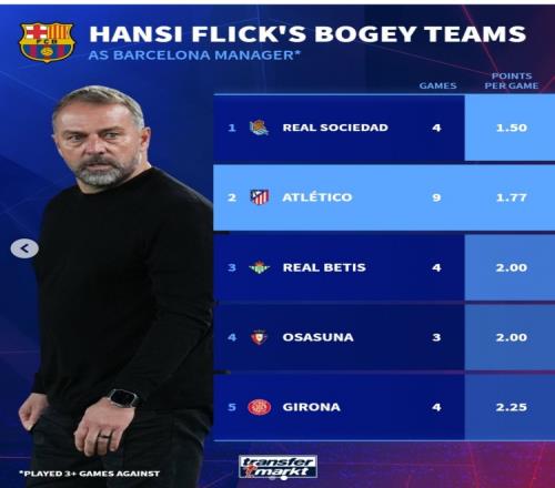 弗里克執(zhí)教巴薩以來(lái)克星排名(至少對(duì)陣3場(chǎng)):