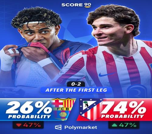 巴薩如今的晉級(jí)概率下跌至26%,較首回合前下跌了47%,馬競(jìng)的晉級(jí)概率則升至74%,較首回合上升了47%。