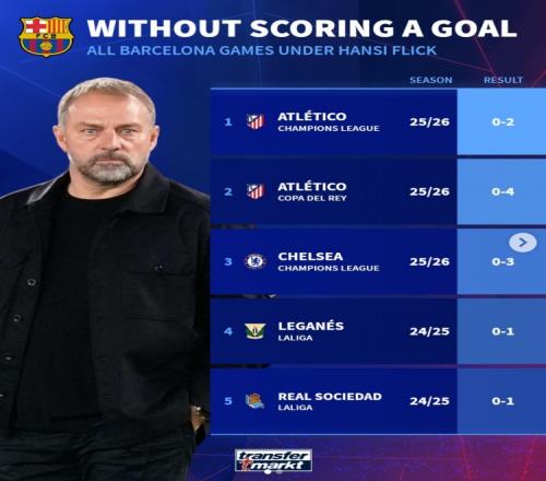 弗里克執(zhí)教巴薩以來5次被零封: