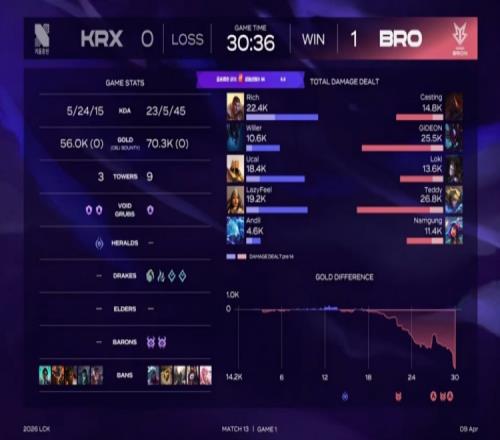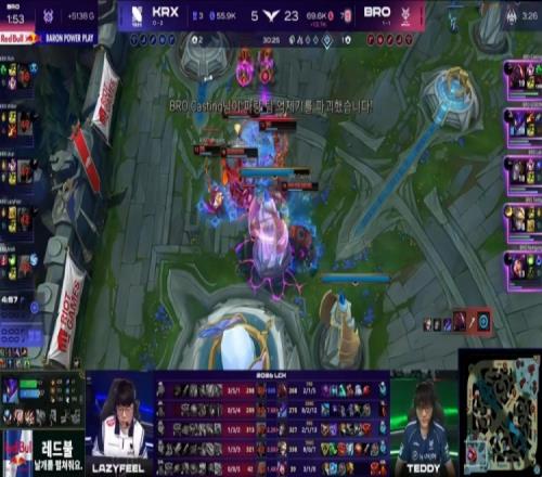 后期Willer夢(mèng)魘關(guān)燈飛下終于配合Ucal沙皇拿到GIDEON螳螂大人頭,Teddy支援到位再殺Ucal,BRO經(jīng)濟(jì)優(yōu)勢(shì)來(lái)到9k。下路團(tuán)戰(zhàn),Andil冰鳥(niǎo)封墻,Loki發(fā)條TP落地就被擊殺,Rich杰斯錘三人,Teddy伊澤瑞爾操作拉滿爆轟三殺配合GIDEON雙人五殺,BRO團(tuán)滅KRX,隨后BRO上路一波再次團(tuán)滅KRX,推平基地先下一城。