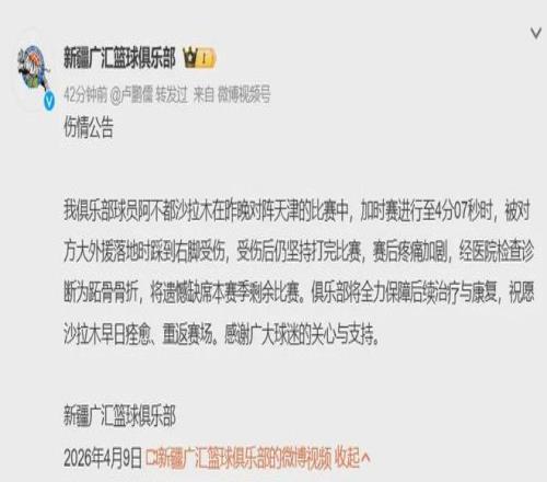 新疆隊(duì)官方宣布:阿不都沙拉木賽季報銷......