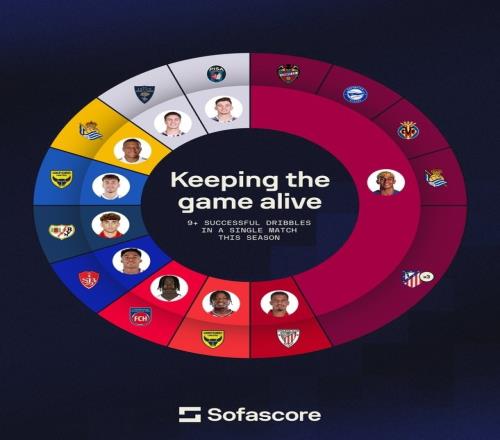 其中對陣馬競便有3場。而與此同時,五大聯(lián)賽其他球員同期最多只有一場成功過人9+。
