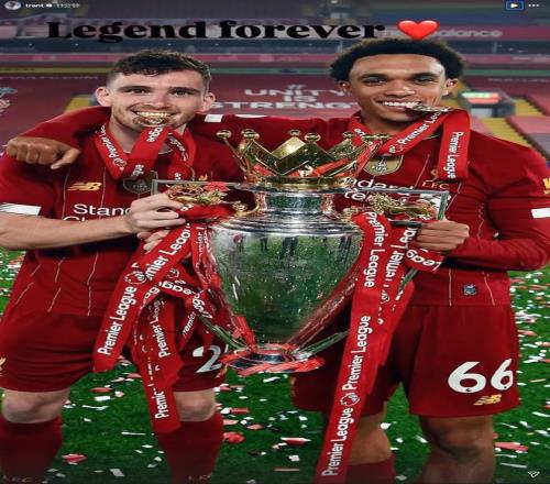 去年夏天離開利物浦的阿諾德在社交媒體曬出他和羅伯遜在2019-20賽季手捧英超冠軍獎(jiǎng)杯的合照,并配文:“永遠(yuǎn)的傳奇??”