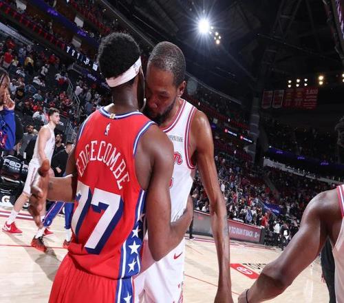 轉(zhuǎn)折點(diǎn)出現(xiàn)在第四節(jié)。烏布雷帶著一群替補(bǔ)突然覺醒,單節(jié)轟出29-17,一度把分差咬到5分。這是76人全場(chǎng)唯一像NBA球隊(duì)的12分鐘——烏布雷16分3搶斷,VJ Edgecombe賽后和杜蘭特?fù)肀У恼掌踔劣悬c(diǎn)溫情。但前面挖的坑太深,最終102-113落敗。