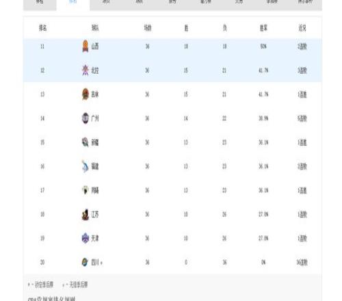 此外,季后賽爭奪戰(zhàn)同樣激烈,第12名北控和第13名吉林勝場數(shù)相同,均為15個;第14名廣州僅落后他們1個勝場,季后賽最后1張入場券基本在他們?nèi)?duì)中誕生。