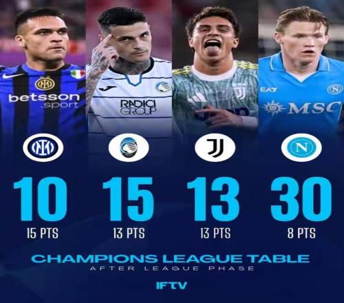 不只是國(guó)家隊(duì),意甲俱樂(lè)部的歐戰(zhàn)成績(jī)同樣江河日下。本賽季,意甲4支歐冠球隊(duì)只有亞特蘭大一隊(duì)打進(jìn)十六強(qiáng),但也就此止步;國(guó)米、尤文在附加賽中分別不敵博德閃耀和加拉塔薩雷而無(wú)緣十六強(qiáng),那不勒斯更是連附加賽的線都沒(méi)碰到,小組賽直接出局了!
