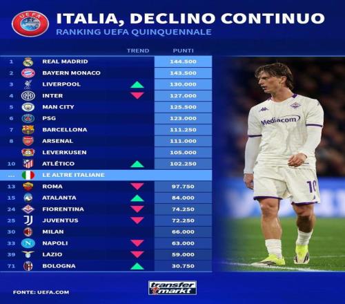 糟糕的歐戰(zhàn)表現(xiàn)也影響到了俱樂(lè)部及意甲整體的歐戰(zhàn)積分情況。
