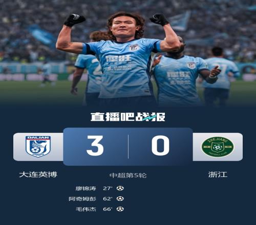 全場比賽結(jié)束,大連英博3-0戰(zhàn)勝浙江隊(duì)。