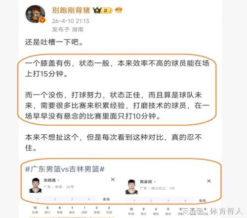 然而,杜鋒的這番話,卻遭到了CBA記者“別跑剛背豬”的質(zhì)疑,他認為杜鋒在用人方面,有大問題,受傷的球員,打得一般,效率不高的張皓嘉,在場上打了15分鐘。反觀,沒有傷病,而且,打球十分努力,狀態(tài)也是十分不錯的陳家政,卻只打了10分鐘,這樣的情況,明顯是存在問題。