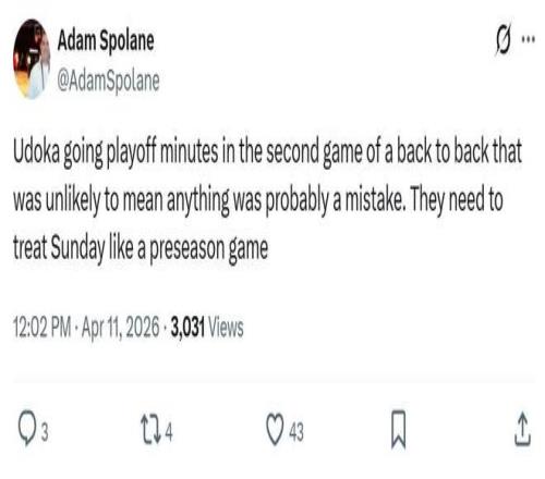 賽后火箭隊(duì)記Adam Spolane公開怒批烏度卡,在背靠背第二場,勝負(fù)大概率無關(guān)緊要的情況下,還是讓主力打了季后賽級別的登場時(shí)間。