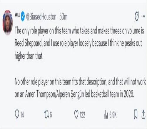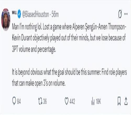 他繼續(xù)寫道:在這場比賽中,申京、杜蘭特、阿門都發(fā)揮出色,但最終火箭輸球了,原因就在于三分產(chǎn)量與三分命中率。很明顯休賽期我們的目標(biāo)就是找到那些能穩(wěn)定命中遠(yuǎn)投又能承擔(dān)大量進(jìn)攻任務(wù)的球員。