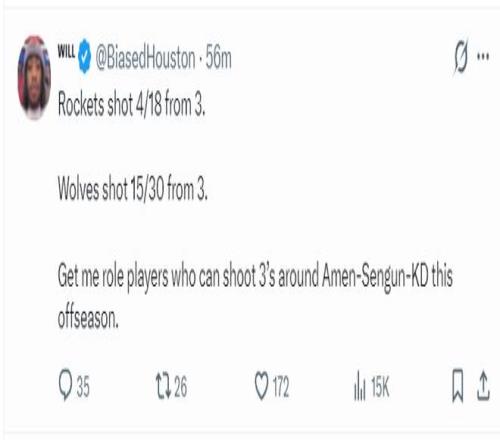 火箭記者Will寫道:森林狼全場三分30中15,而火箭三分球18中4,請?jiān)谛葙惼趪@阿門、申京、杜蘭特補(bǔ)強(qiáng)能投進(jìn)三分球的球員。(烏度卡也在賽后表示這場比賽失利的關(guān)鍵就是三分球無法命中)
