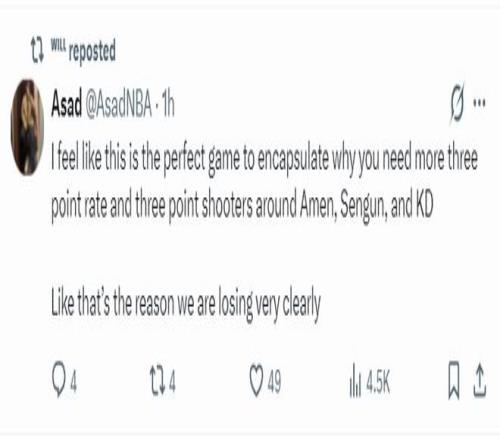 休媒Asad寫道:我覺得這場比賽正好能說明為什么我們需要更多的投手來圍繞阿門、申京、杜蘭特等人,因?yàn)槲覀冋谠馐苋智蛱顜淼膿p失。
