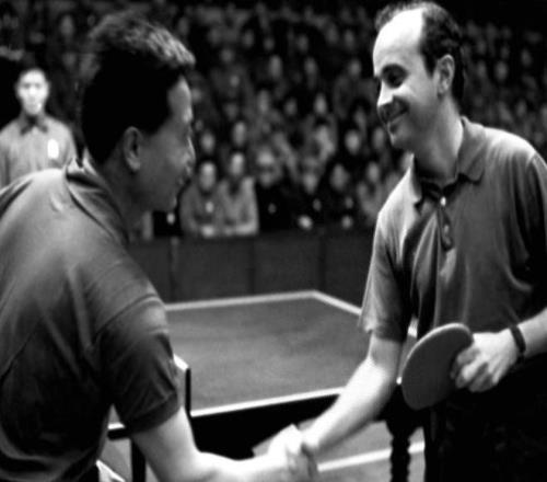 整個班車行程約15分鐘,還有5分鐘就抵達目的地了。就在這時,坐在后排的中國名將莊則棟站了起來,在隊友驚異的目光中,走到科恩身邊,開始自我介紹??贫髯匀徽J識三屆世錦賽冠軍莊則棟,情緒一下子變得很激動。