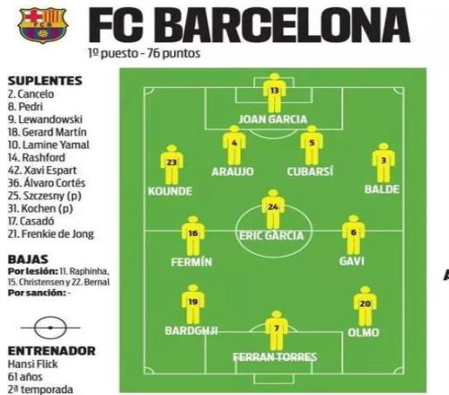 每體預(yù)測(cè)巴薩首發(fā):巴德吉、加維出戰(zhàn),佩德里、亞馬爾替補(bǔ)