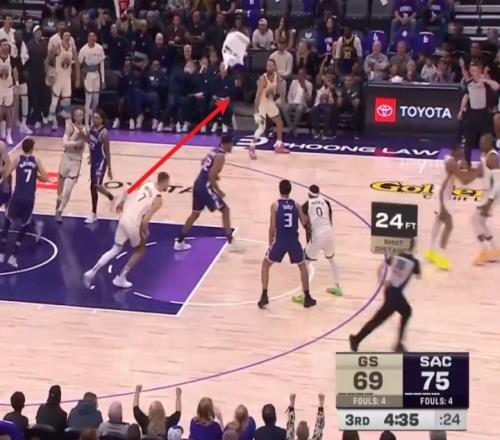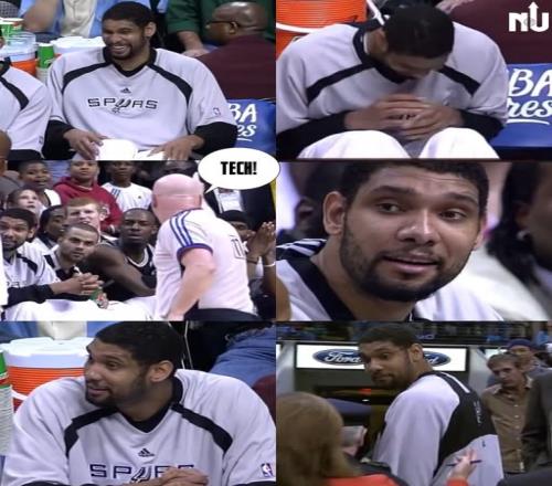 比賽中,庫里因為在板凳席揮毛巾不小心踩進球場,被吹了一個技術犯規(guī),也算是對鄧肯在板凳席因為笑而吃T的致敬了!