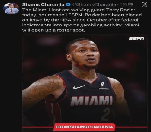 爆料王Shams:熱火裁掉深陷賭球風波的后衛(wèi)特里-羅齊爾。