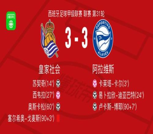 北京時(shí)間4月11日西班牙足球甲級聯(lián)賽 聯(lián)賽 第31輪,皇家社會主場對陣阿拉維斯?;始疑鐣K契奇破門,奧斯卡松破門,卡萊塔-卡爾自擺烏龍。阿拉維斯易卜拉欣-迪亞巴特破門,盧卡斯-博耶破門,西韋拉自擺烏龍。最終比分皇家社會 3-3 阿拉維斯。
