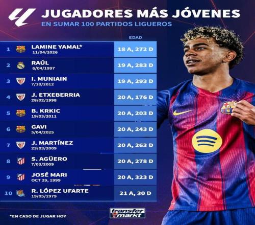 根據(jù)統(tǒng)計,本場比賽是亞馬爾職業(yè)生涯第100次在西甲登場,這位西班牙天才也就此以18歲272天的年紀(jì)超越了皇馬的傳奇球星勞爾,成為西甲歷史達(dá)成百場里程碑最年輕的球員。