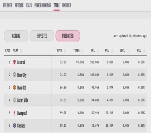 輸?shù)暨@場(chǎng)比賽后,阿森納多賽兩場(chǎng)領(lǐng)先曼城9分。Opta的奪冠概率預(yù)測(cè)從97%降到了93.5%——仍然高得驚人,卻也脆弱得讓人心驚。