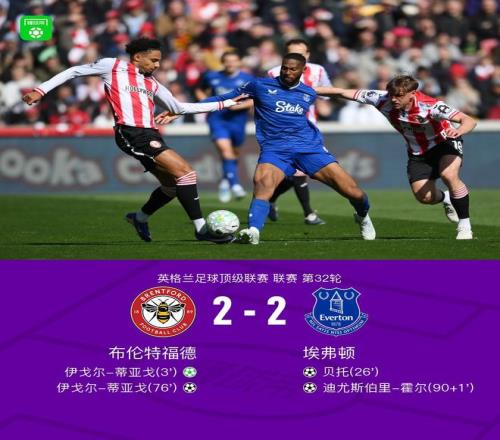 北京時間4月11日22:00,英超第32輪,布倫特福德主場對陣埃弗頓。上半場,皮克福德鏟倒沙德被判罰點球,伊戈爾-蒂亞戈點射命中,布蘭斯韋特遠射打偏,貝托頭球扳平比分。下半場,內(nèi)森-科林斯頭球攻門擊中門框,卡約德射門打在伊戈爾-蒂亞戈身上彈進球門,霍爾補時抽射絕平,最終,布倫特福德2-2埃弗頓遭聯(lián)賽4連平。