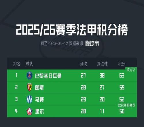 法甲是目前五大聯(lián)賽里一二名積分最接近的,排名第一的大巴黎少賽一場領(lǐng)先第二朗斯4分。