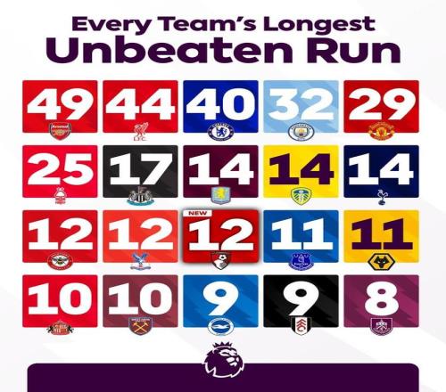 在伯恩茅斯創(chuàng)造隊(duì)史英超最長(zhǎng)不敗紀(jì)錄后,英超官方列出本賽季英超各支球隊(duì)的歷史英超最長(zhǎng)不敗紀(jì)錄。