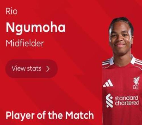 兜射破門,17歲小將恩古莫哈當選利物浦vs富勒姆全場最佳球員