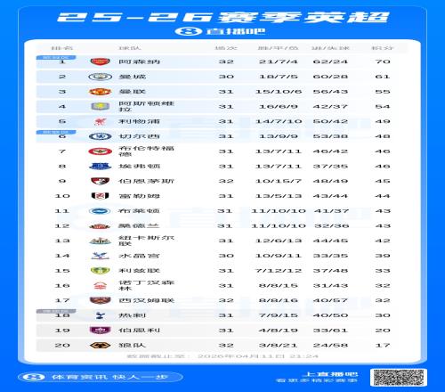 還有懸念!英超積分榜:阿森納多賽2場領先9分,曼城將客戰(zhàn)切爾西 直播吧 2026-04-12 07:24:59 體育播報04月11日宣 英超第32輪結(jié)束一場較量,阿森納主場1-2負于伯恩茅斯,多賽兩場對曼城的領先優(yōu)勢仍為9分,曼城將在明晚23點30客場對陣切爾西;完整英超積分榜如下。 足球切爾西曼城阿森納英超 上一篇: 補時落后踢丟絕佳機會!約克雷斯急得咬衣角下一篇: 約克雷斯本場4射1正進1球+1失良機11對抗4成功+2造犯規(guī)獲6.6分