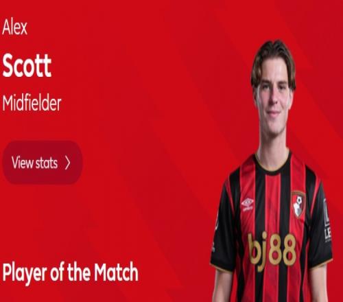 本場(chǎng)比賽伯恩茅斯中場(chǎng)斯科特表現(xiàn)活躍,打進(jìn)球隊(duì)第二粒進(jìn)球,賽后他也當(dāng)選英超官方評(píng)選出的本場(chǎng)比賽最佳球員。