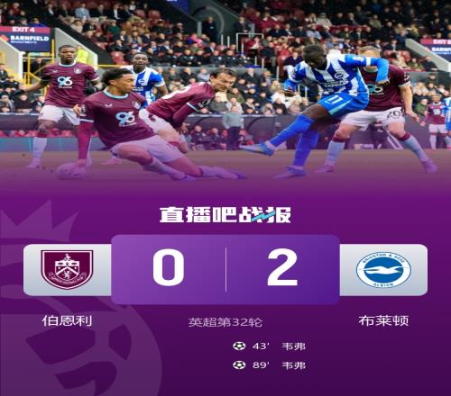 下半場傷停補時6分鐘,全場比賽結(jié)束,最終布萊頓2-0伯恩利。