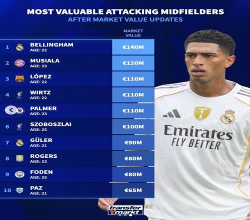 北京時間4月12日,德轉(zhuǎn)列出了世界足壇前腰球員身價前10,皇家馬德里的貝林厄姆以1.4億歐元排名第一,拜仁慕尼黑的穆西亞拉以1.2億歐元排名第二,費爾明-洛佩斯、維爾茨以及帕爾默三人同以1.1億歐元并列第三位。