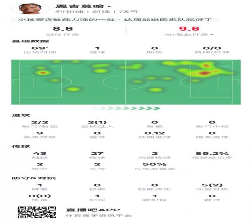 恩古莫哈本場(chǎng)數(shù)據(jù):1進(jìn)球1過人成功2關(guān)鍵傳球,評(píng)分8.6
