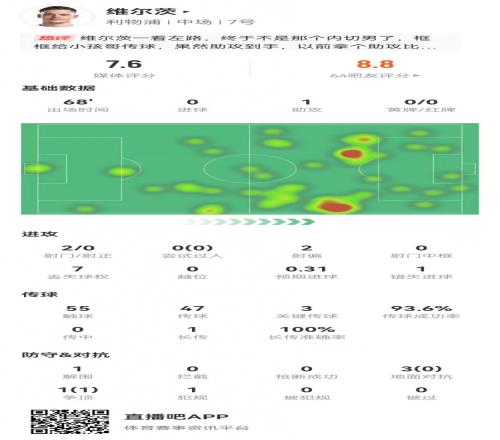 體育播報4月12日宣 利物浦在本輪英超對陣富勒姆,維爾茨本場數(shù)據(jù)如下: