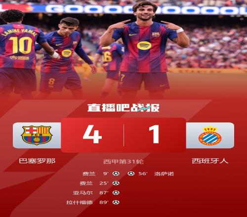 體育播報(bào)4月12日宣 北京時(shí)間4月12日00:30,西甲第31輪巴塞羅那迎戰(zhàn)西班牙人的比賽在諾坎普球場進(jìn)行,上半場亞馬爾助攻費(fèi)蘭頭球破門閃擊得手,隨后亞馬爾再度助攻費(fèi)蘭推射破門擴(kuò)大比分,德米特洛維奇獻(xiàn)精彩撲救,半場結(jié)束,巴薩2-0西班牙人。下半場洛薩諾爆射扳回一城,德米特洛維奇出擊解圍失誤,亞馬爾推射空門,德容助攻拉什福德建功,最終巴薩4-1西班牙人聯(lián)賽7連勝9分領(lǐng)跑。