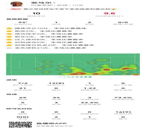 體育播報(bào)4月12日宣 巴薩在本輪西甲對(duì)陣西班牙人,亞馬爾本場(chǎng)數(shù)據(jù)如下: