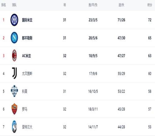 在積分榜上,國際米蘭遙遙領(lǐng)先,以72分高居榜首,戰(zhàn)績是23勝3平5負。而那不勒斯以65分排名第2,落后了7分,爭冠難度很大。AC米蘭輸球,依然是63分,排名第3。AC米蘭此前是奪冠熱門之一,由于近段時間頻頻丟分,導(dǎo)致爭冠形勢惡化,現(xiàn)如今爭冠基本失去希望。尤文圖斯以60分排名第4。第5的是科莫,拿到58分。科莫比尤文圖斯少踢1場,接下來還是有希望超越尤文圖斯。羅馬以57分排名第6。
