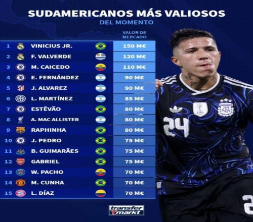 德國轉(zhuǎn)會市場列出了南美球員身價排名,維尼修斯1.5億歐居首,巴爾韋德1.2億歐次席。南美球員德轉(zhuǎn)身價榜: