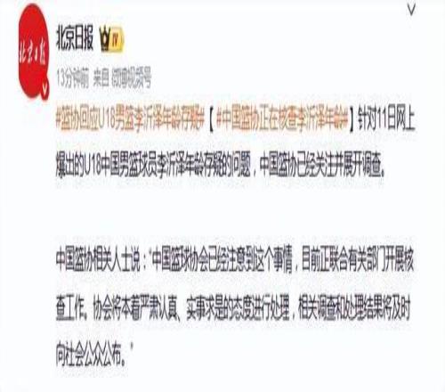 北京時(shí)間4月12日消息,中國(guó)籃球協(xié)會(huì)已就U18國(guó)青球員李沂澤年齡爭(zhēng)議正式回應(yīng),目前正聯(lián)合相關(guān)部門開展核查工作,承諾將本著嚴(yán)肅、實(shí)事求是的原則處理,并及時(shí)公布結(jié)果。