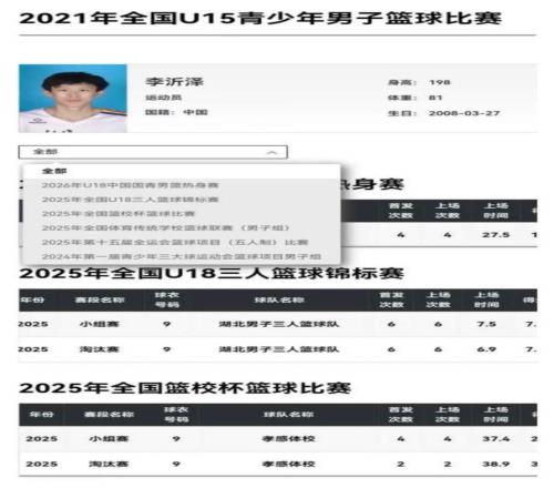 2019年U15全國(guó)預(yù)賽中,張涵泊與2005年出生的楊瀚森同場(chǎng)競(jìng)技,后者此后有清晰的U17、U18亞錦賽、U19世界杯及CBA參賽記錄。 李沂澤則在2024年突然以“18歲”身份在U18賽事中爆發(fā),此前無任何青少年賽事數(shù)據(jù)積累,引發(fā)公眾對(duì)其“改名改齡”以多打一屆全運(yùn)會(huì)的質(zhì)疑。