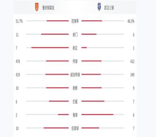 本場(chǎng)數(shù)據(jù)方面,銅梁龍與三鎮(zhèn)的控球率是51.7%-48.3%、射門(mén)是11-6、角球是2-6、搶斷是10-9。數(shù)據(jù)上,銅梁龍面對(duì)昔日中超冠軍,也完全不落下風(fēng)。