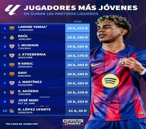 西甲出戰(zhàn)100場最年輕球員榜:亞馬爾居首,勞爾、穆尼亞因前三
