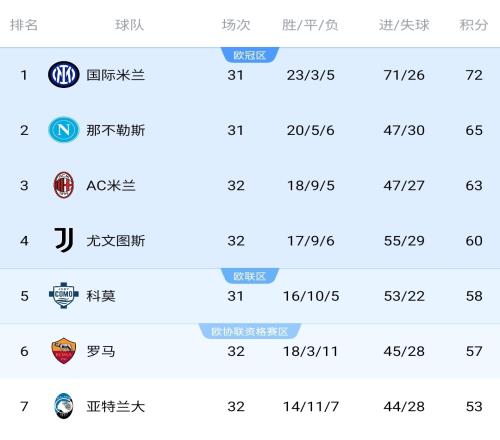 尤文本輪贏球先賽升第4,擊敗競(jìng)爭(zhēng)對(duì)手亞特蘭大贏下6分戰(zhàn),科莫?jiǎng)t將主場(chǎng)對(duì)陣榜首的國(guó)米,羅馬仍居第6,而輸球的亞特蘭大已經(jīng)掉隊(duì)。
