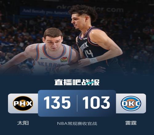首節(jié)對(duì)決太陽(yáng)迅速進(jìn)入狀態(tài)轟出26-8的進(jìn)攻高潮迅速接管比賽,雷霆?jiǎng)t狀態(tài)糟糕前8分鐘里僅得8分,糟糕的第一節(jié)也直接奠定他們一路被動(dòng)追分;次節(jié)雷霆進(jìn)攻端回暖但也阻止不了對(duì)手,兩隊(duì)次節(jié)雙雙砍下33分,太陽(yáng)這邊鄧恩和布耶聯(lián)手砍下34分帶隊(duì)取得18分領(lǐng)先進(jìn)入下半場(chǎng)。休息歸來(lái)雷霆表現(xiàn)依舊不慍不火,太陽(yáng)則連續(xù)三節(jié)轟下30+得分勢(shì)不可擋,三節(jié)結(jié)束時(shí)分差已經(jīng)來(lái)到27分,末節(jié)也早早進(jìn)入練兵時(shí)間沒(méi)有再起波瀾。最終,太陽(yáng)客場(chǎng)大勝雷霆拿下比賽為常規(guī)賽畫(huà)上圓滿句號(hào)。