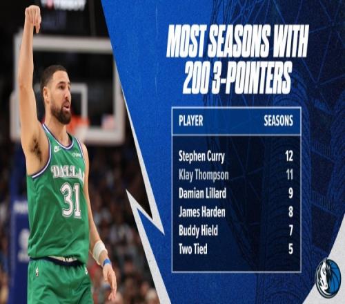 獨(dú)行俠球員克萊在首節(jié)比賽還剩3分57秒時(shí)投進(jìn)了他本賽季的第200個(gè)三分球。