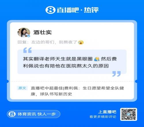 關(guān)于球迷關(guān)心的“黑眼圈”問題,翻譯本人也借機(jī)進(jìn)行了回應(yīng):“這個不是熬夜熬的,這是天生的”“費(fèi)利佩說最近說又變黑了,因?yàn)槟菐滋煸卺t(yī)院,我陪他陪了幾天,在醫(yī)院一直沒睡好”。