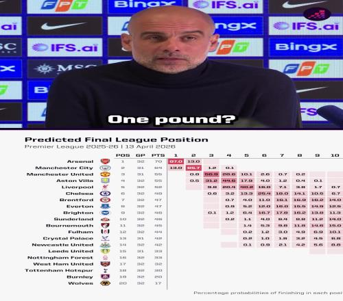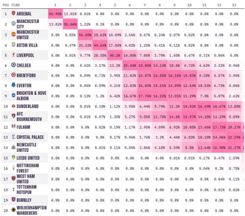 仍然看好槍手!opta最新預(yù)測阿森納奪冠概率87%,曼城僅有13%