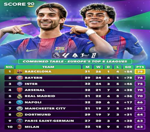 外媒列五大聯(lián)賽合并積分榜:巴薩79分居首,拜仁國米槍手分列24